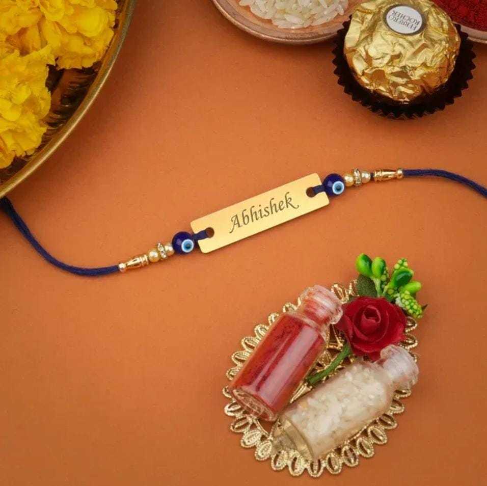 Celebrate this Raksha Bandhan with a touch of tradition and protection with our Customized Evil Eye Name Rakhi. Expertly crafted with a powerful Evil Eye charm and personalized with your brother’s name, this rakhi blends spiritual significance with a personal touch. The Evil Eye is believed to ward off negativity and bring good fortune, making it a meaningful and stylish gift for your beloved brother.